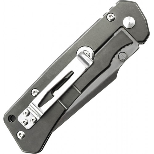 Framelock. 4 7/8" closed. 3 5/8" titanium coated 9Cr18MoV standard edge stainless drop point blade with dual thumb studs. Black textured G-10 front handle and titanium coated stainless frame on back. Lanyard hole. Stainless pocket clip with slot cutout design.