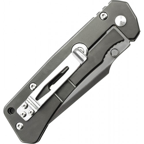 Schrade Titanium Drop Point Framelock. 4 7/8" closed. 3 5/8" titanium coated 9Cr18MoV partially serrated stainless drop point blade with dual thumb studs. Black textured G-10 front handle and titanium coated stainless frame on back. Lanyard hole. Stainless pocket clip with slot cutout design.