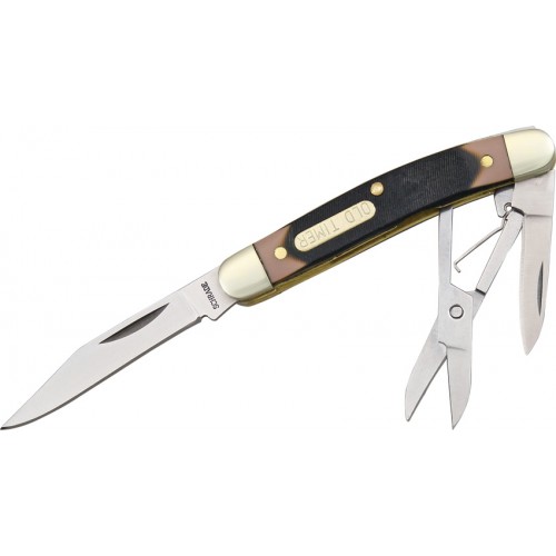 Old Timer Series. 2 3/4" closed. Stainless clip and pen blades and scissors. Brown sawcut Delrin handles with nickel silver bolsters and Old Timer inlay shield.