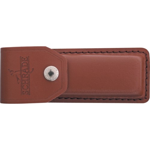 Schrade Uncle Henry Smoky. 3 3/4" closed lockback. Stainless clip blade. Wood handles with brass bolsters. Brown leather belt sheath.