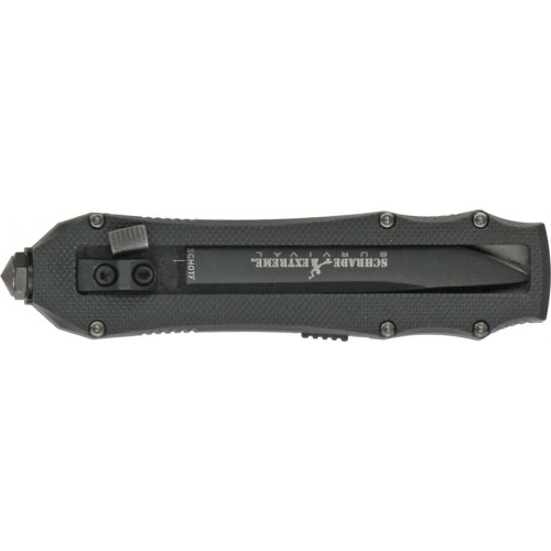 Schrade Out The Front Speed Assisted Folder. Black handle casing. 4 1/2" closed. Black finish stainless blade. Black Zytel handle casing with integrated glass breaker tip. Speed assisted technology allows the blade to be released with the flick of a button. Blade lock mechanism. Pocket clip.