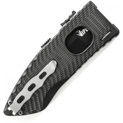 4 7/8" closed. 3 5/8" assisted opening 4034 stainless partially serrated tanto blade with black finish. Textured black aluminum handles with oversized finger slot. Features the "Side Assist". To use, make sure the side safety button is the down, "OFF", position (red dot will be showing to indicate the knife is ready to open). Firmly hold knife in hand, away from body, using your index finger push on the blade through oversized finger slot to deploy. To release, push release lock down to release blade and then fold the blade into