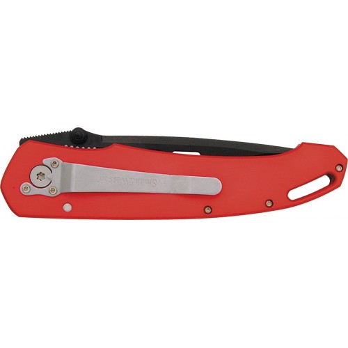 4 3/4" closed. Black coated stainless partially serrated tactical drop point blade with ambidextrous thumb studs. Red anodized aluminum handles with black composition inlay. Stainless pocket clip. Lanyard slot. Boxed.