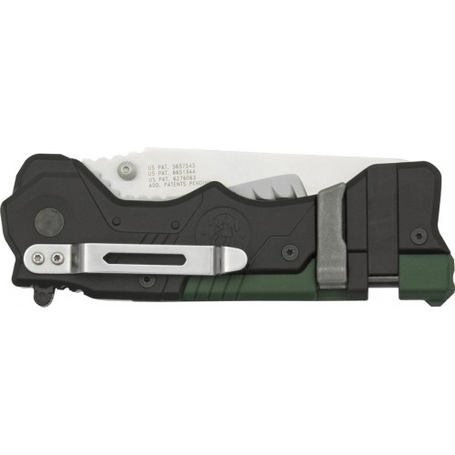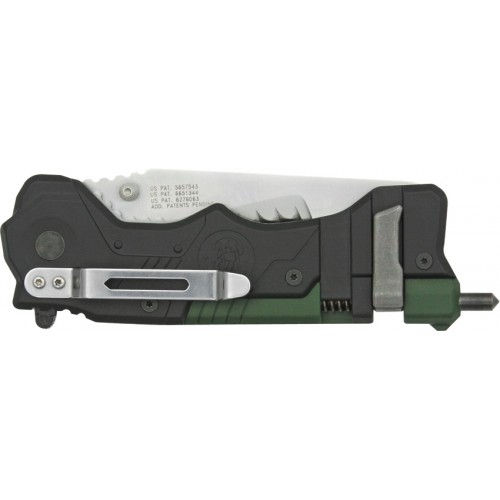 4 3/4" closed linerlock. Assisted opening stainless partially serrated blade with pry tip and thumb studs. Black and green composition handles. Spring loaded glass breaker. Stainless clip.