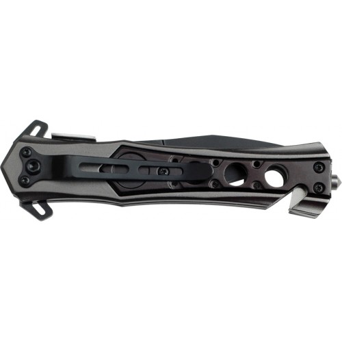 dual extended tangs. Gray anodized aluminum handles with black trim. Air Force shield. Integrated seat belt cutter and glass breaker. Black finish stainless pocket clip.