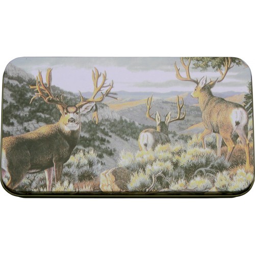 4 1/8" closed. 2 7/8" stainless drop point blade. Lightweight brass finish handle with colorful wildlife artwork sealed under clear acrylic. Embossed feather trim. Colorful gift tin with color artwork on lid and vacuum formed insert.