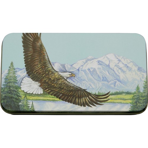 4 1/8" closed. 2 7/8" stainless drop point blade. Lightweight brass finish handle with colorful wildlife artwork sealed under clear acrylic. Embossed feather trim. Colorful gift tin with color artwork on lid and vacuum formed insert.