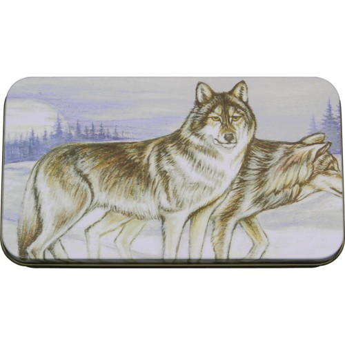 4 1/8" closed. 2 7/8" stainless drop point blade. Lightweight brass finish handle with colorful wildlife artwork sealed under clear acrylic. Embossed feather trim. Colorful gift tin with color artwork on lid and vacuum formed insert.