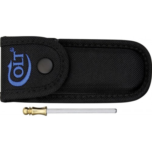 5" closed. 3 1/2" stainless clip blade. Brown checkered wood handles with nickel silver bolsters. One bolster embossed with long tail C. Black nylon belt sheath with sharpening steel.