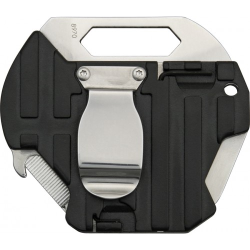 RBT (Range Bag Tool). 2 5/8" closed. In addition to being a secure carry platform for the two standard CTC sight adjustment Allen wrenches, the RBT is a shooters utility pocket tool. Features 1 3/4" stainless partially serrated blade, flat and Phillips fold-out screwdrivers, plus a bottle opener. The two CTC Allen wrenches are securely held in slots between the stainless InterFrame and black Zytel® scales. Removable stainless pocket/gear clip. A collaboration between CRKT and Crimson Trace®. Designed by Glenn Klecker.