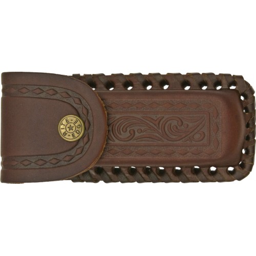5" closed. Damascus steel clip and skinning blades with filework. Stag and buckhorn handles with brass tone bolsters. Fileworked spine. Brown leather belt sheath.
